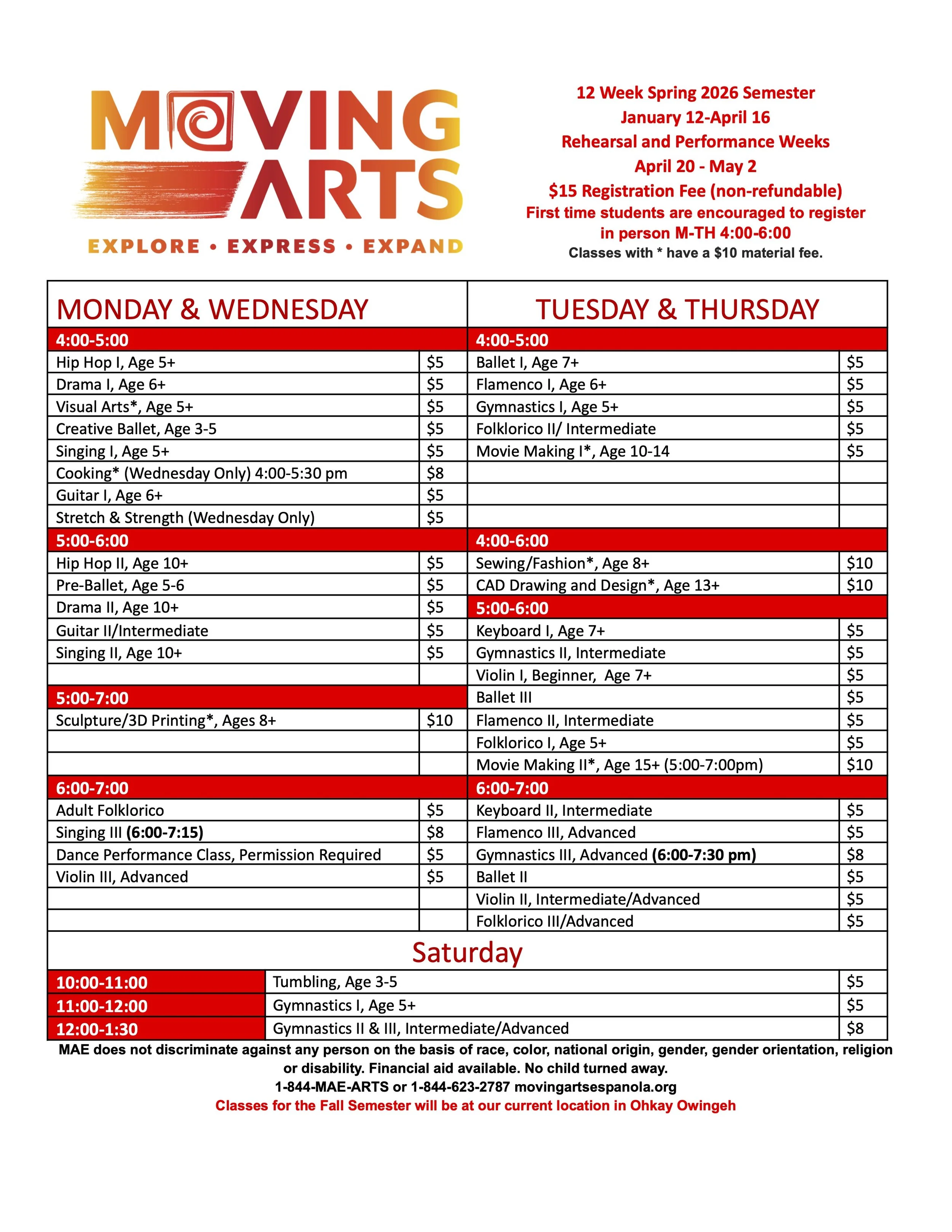 Adult Folklorico is a great opportunity to try something new, get your body moving, and have some fun. Students will learn to command the stage while discovering the rich history of Mexican Folk Dance along with the influences that make it the vibrant art form you see today.